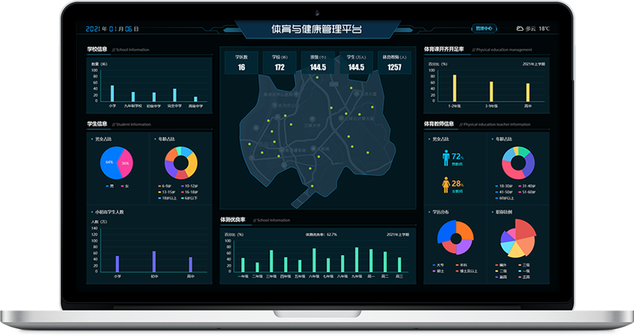 对区域内学校体育运动项目健康数据累加、汇集,按国家和区域教育指标要求进行维度管理,为管理者和研究人员提供实时、精准、客观、可视化的数据统计和分析。为未来区域体育与健康的教育发展提供数据支持和来源