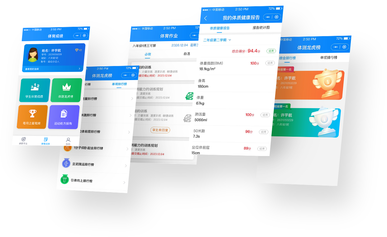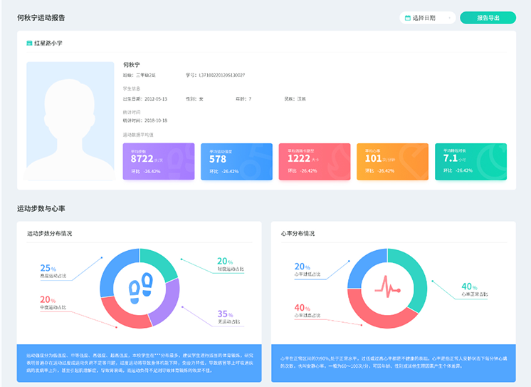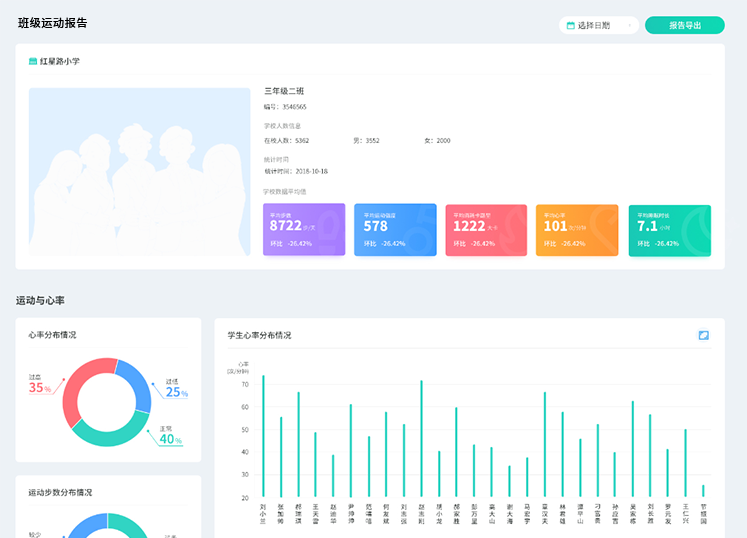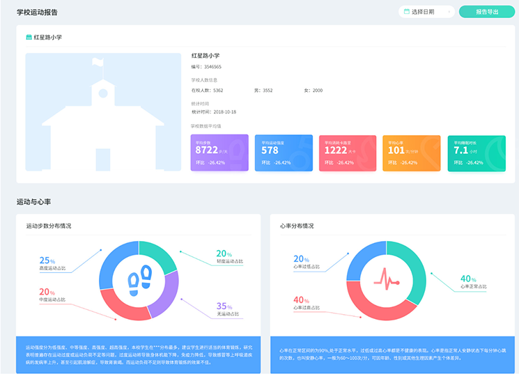 按年级设置学生每天运动锻炼目标;监测分析学生全天在校(体育课、大课间、阳光锻炼),放学后自主锻炼时的运动数据(步数、心率、卡路里消耗、运动时长等),评估学生每天运动目标完成情况;统计分析全校、各年级、班级学生运动目标完成情况;班级、学生每天运动排名;学生、班级日常运动报告